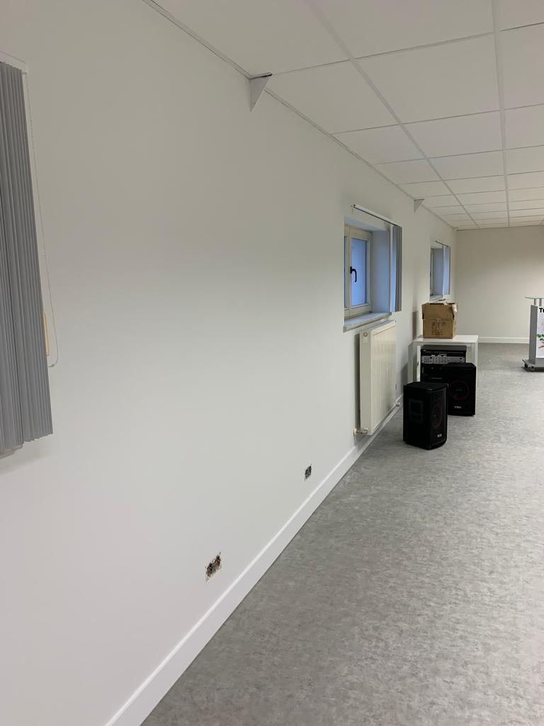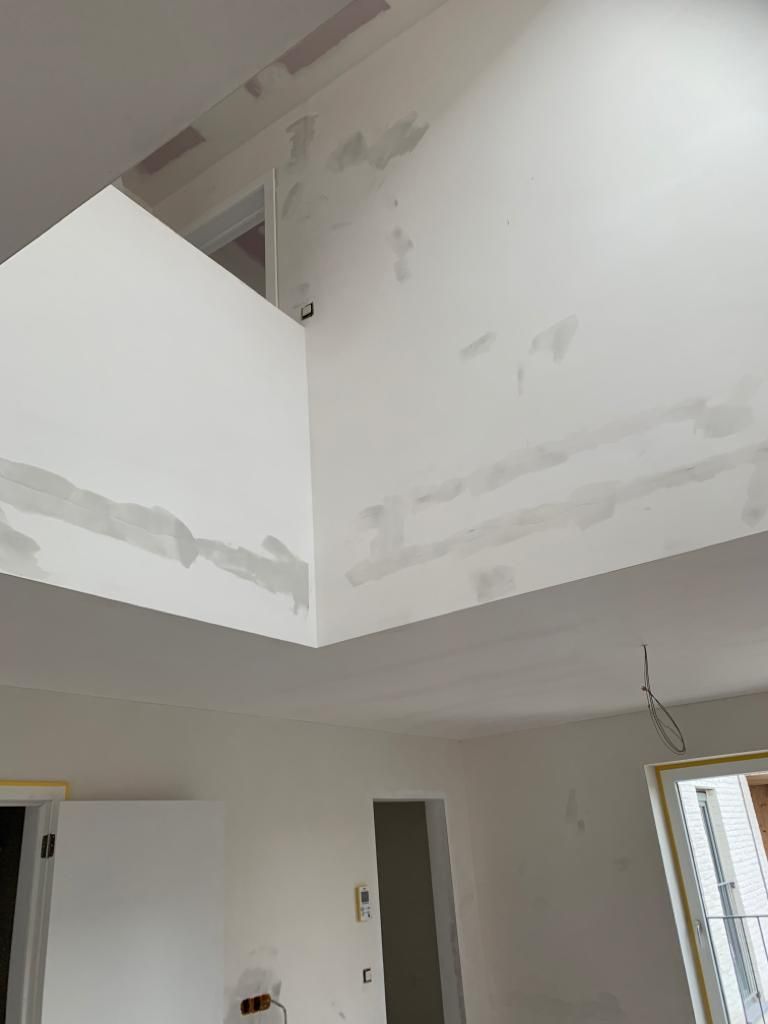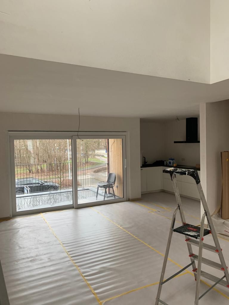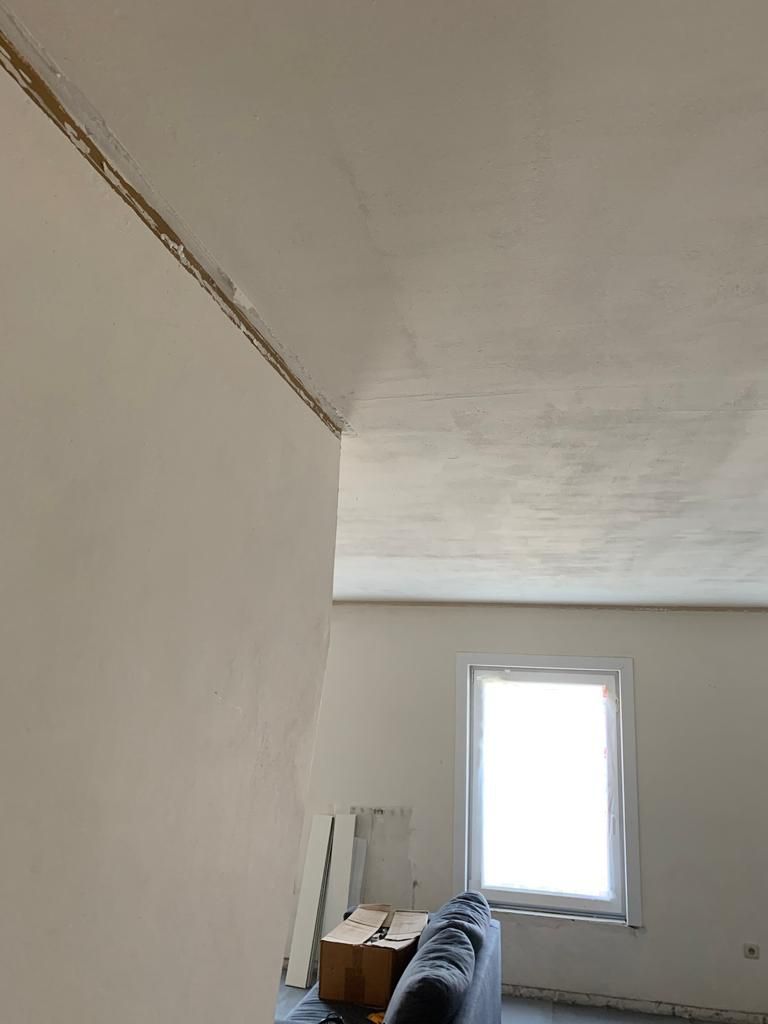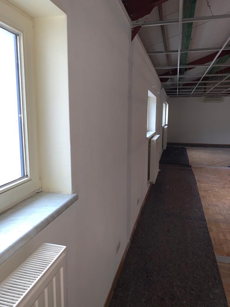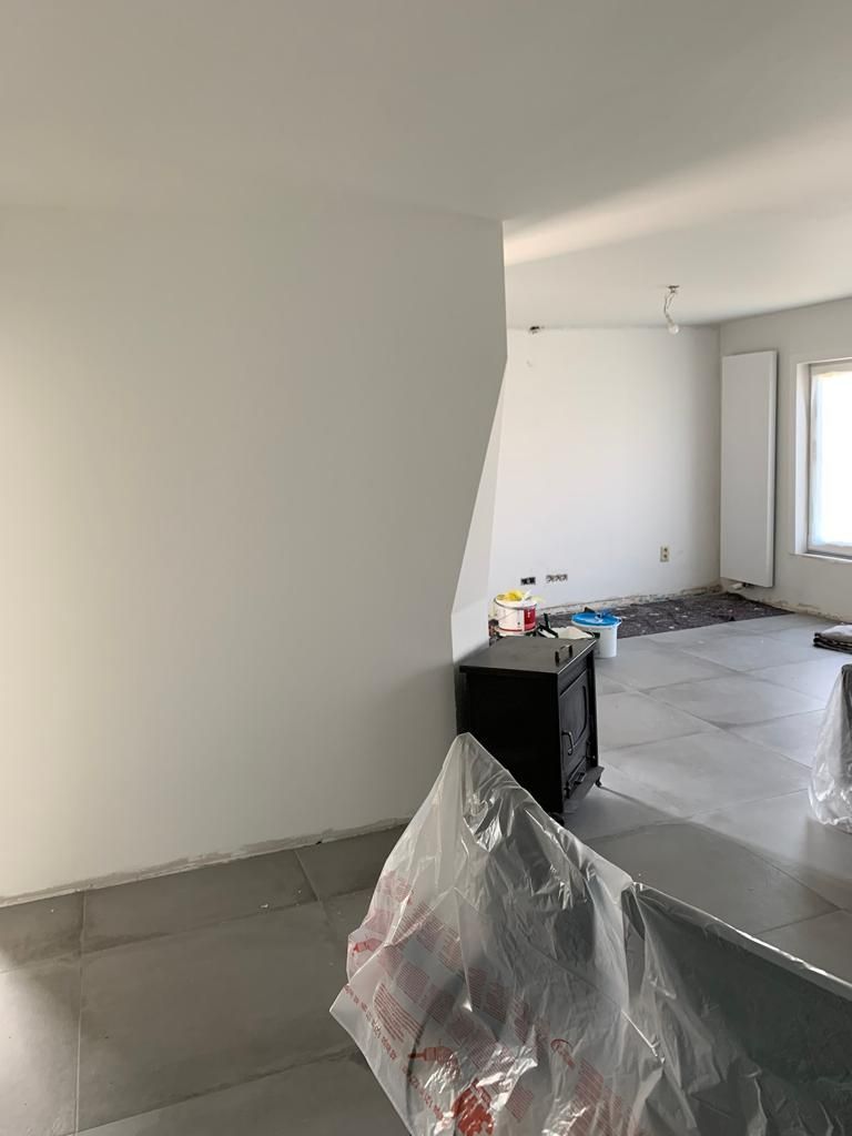 In deze woonkamer waren de muren en plafond in een zeer slechte staat dmv het uitplamuren en schuren van de muren met een afwerking van 1ste klas afwasbare, isolerende verf (Sikkens alphacryl Morpha).