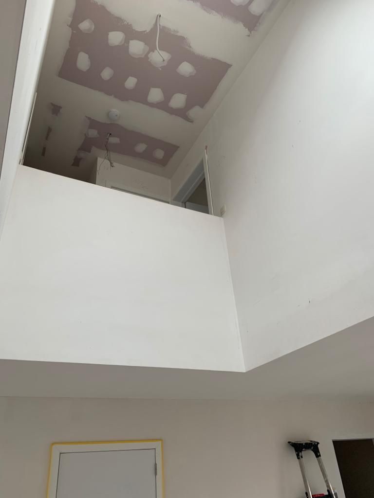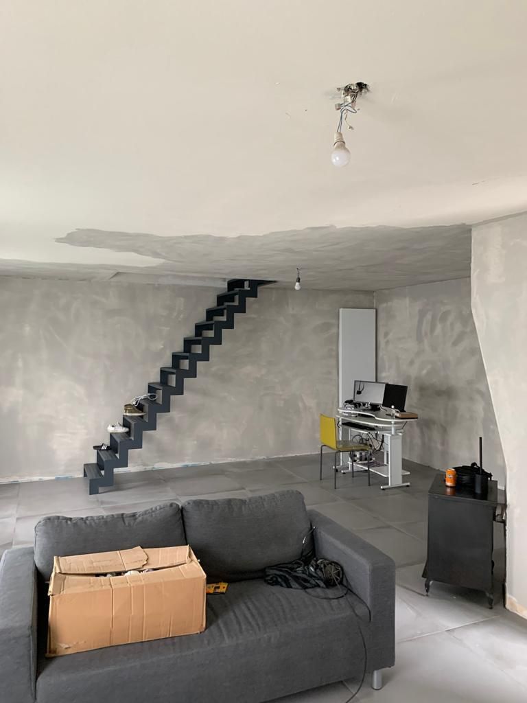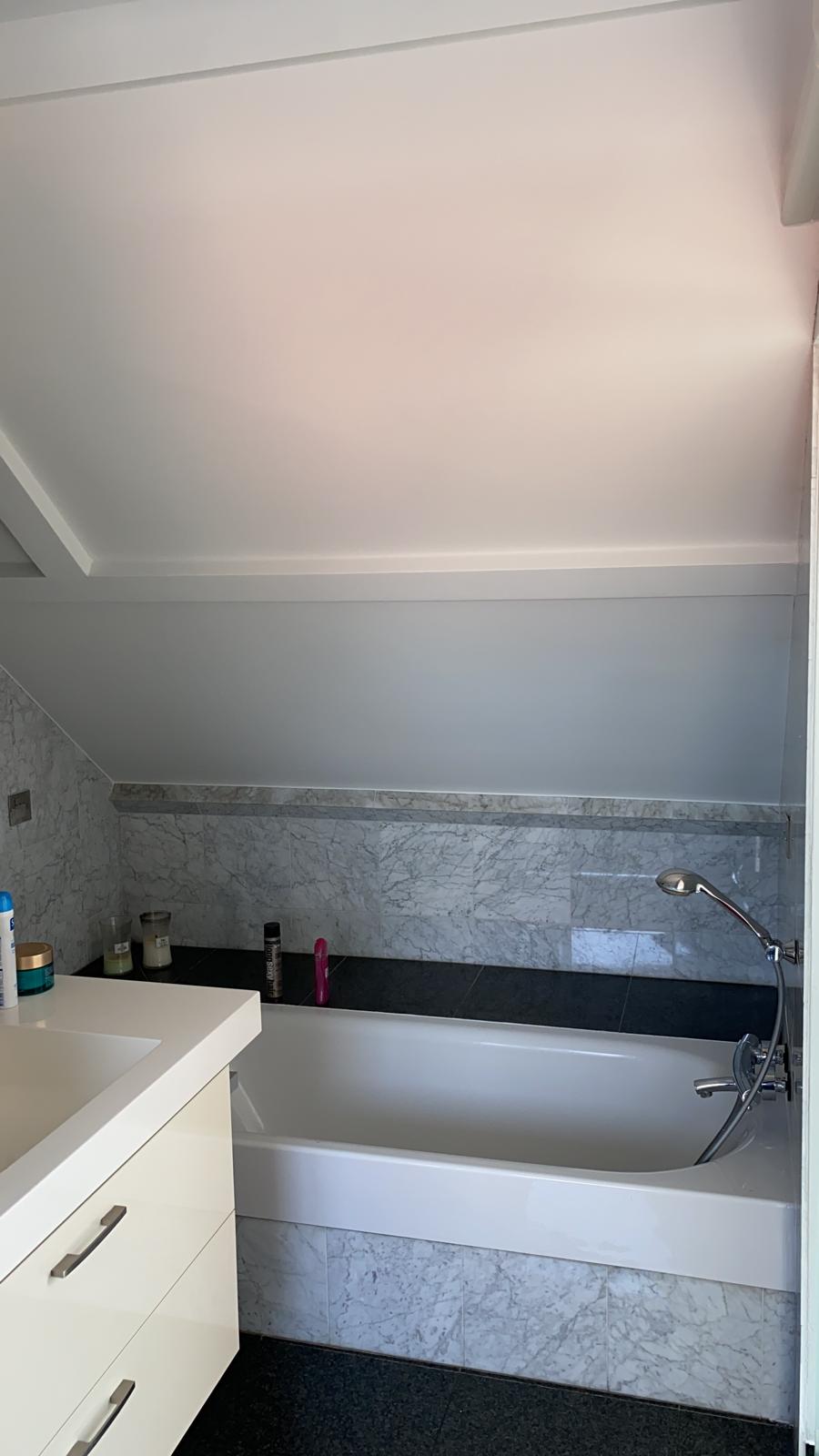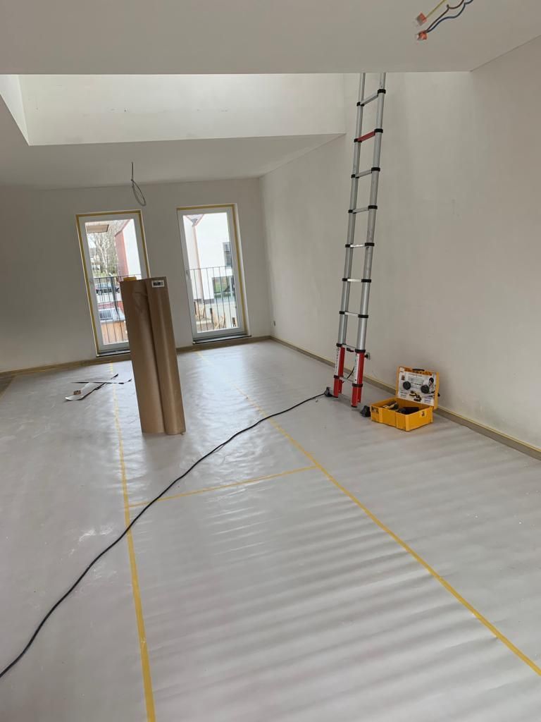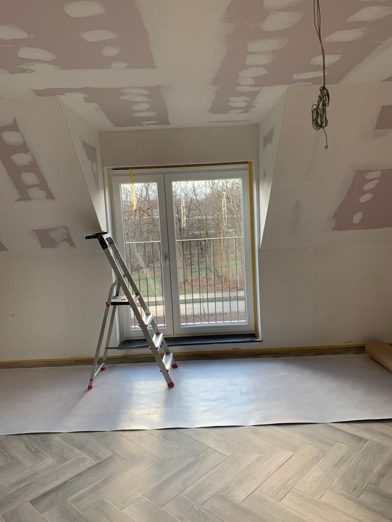 In deze woonkamer waren de muren en plafond in een zeer slechte staat dmv het uitplamuren en schuren van de muren met een afwerking van 1ste klas afwasbare, isolerende verf (Sikkens alphacryl Morpha).
